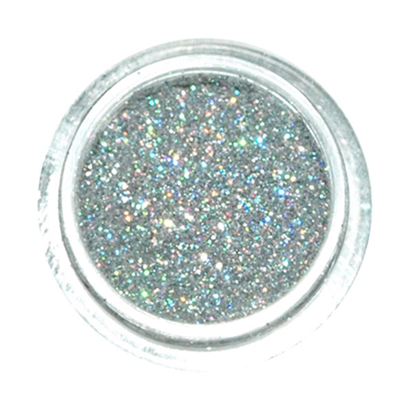 Wysokiej jakości brokat kosmetyczny, idealny do ozdabiania ciała, makijażu, czy tatuaży brokatowych, w pięknym, srebrnym, holograficznym, kolorowo połyskującym kolorze.